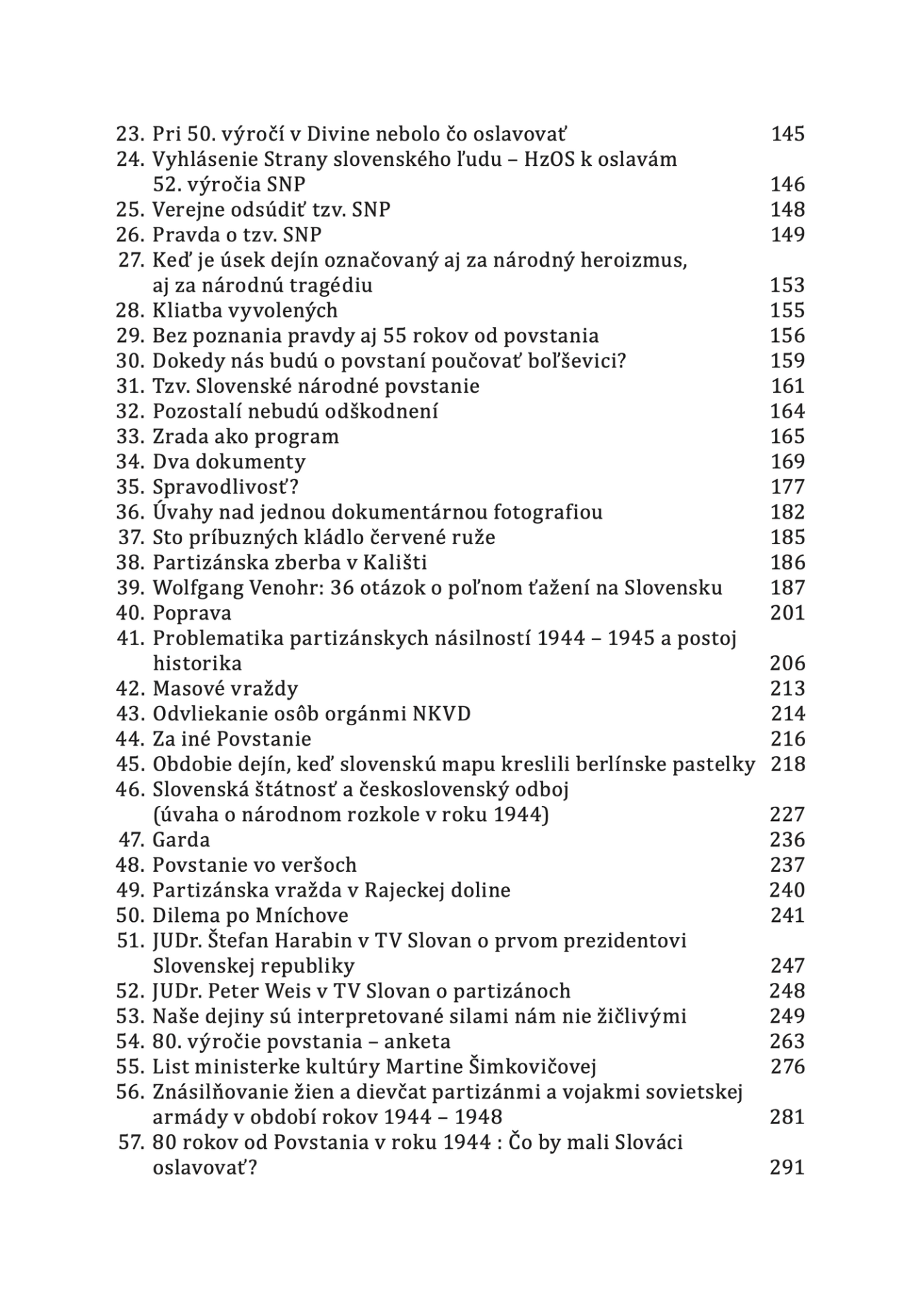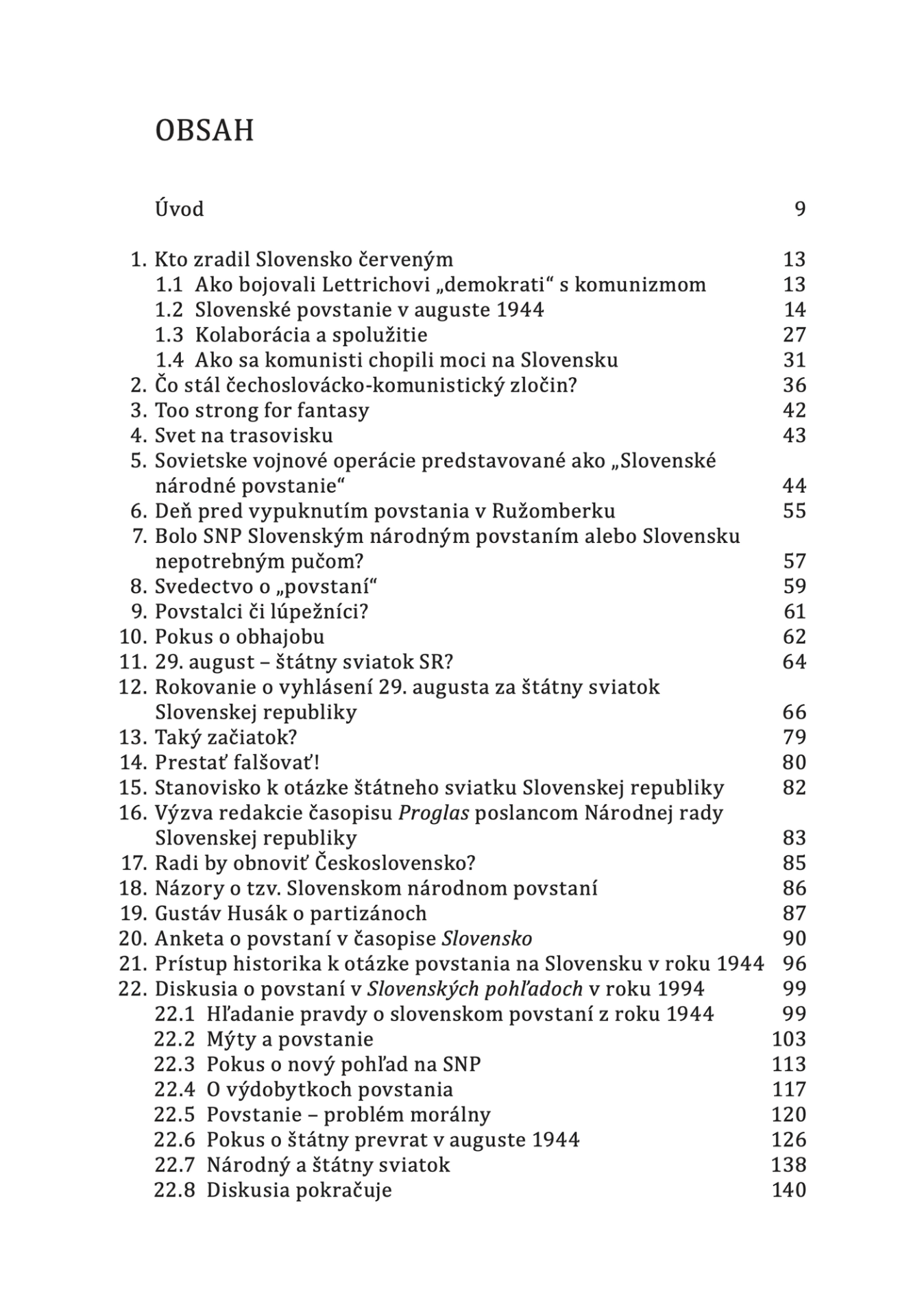 Publikácia Hlasy povstania zadupané štátnym sviatkom predstavuje súbor textov historikov, exulantov, pamätníkov, politikov i verejnosti, ktorí sa odmietli zmieriť s oficiálne preferovanou verziou Slovenského národného povstania z roku 1944. Na 340 stranách zaznieva jasný apel: ak chceme ako spoločnosť dozrieť, musíme si dovoliť slobodne diskutovať aj o témach, ktoré sa desaťročia prezentovali jednostranne.